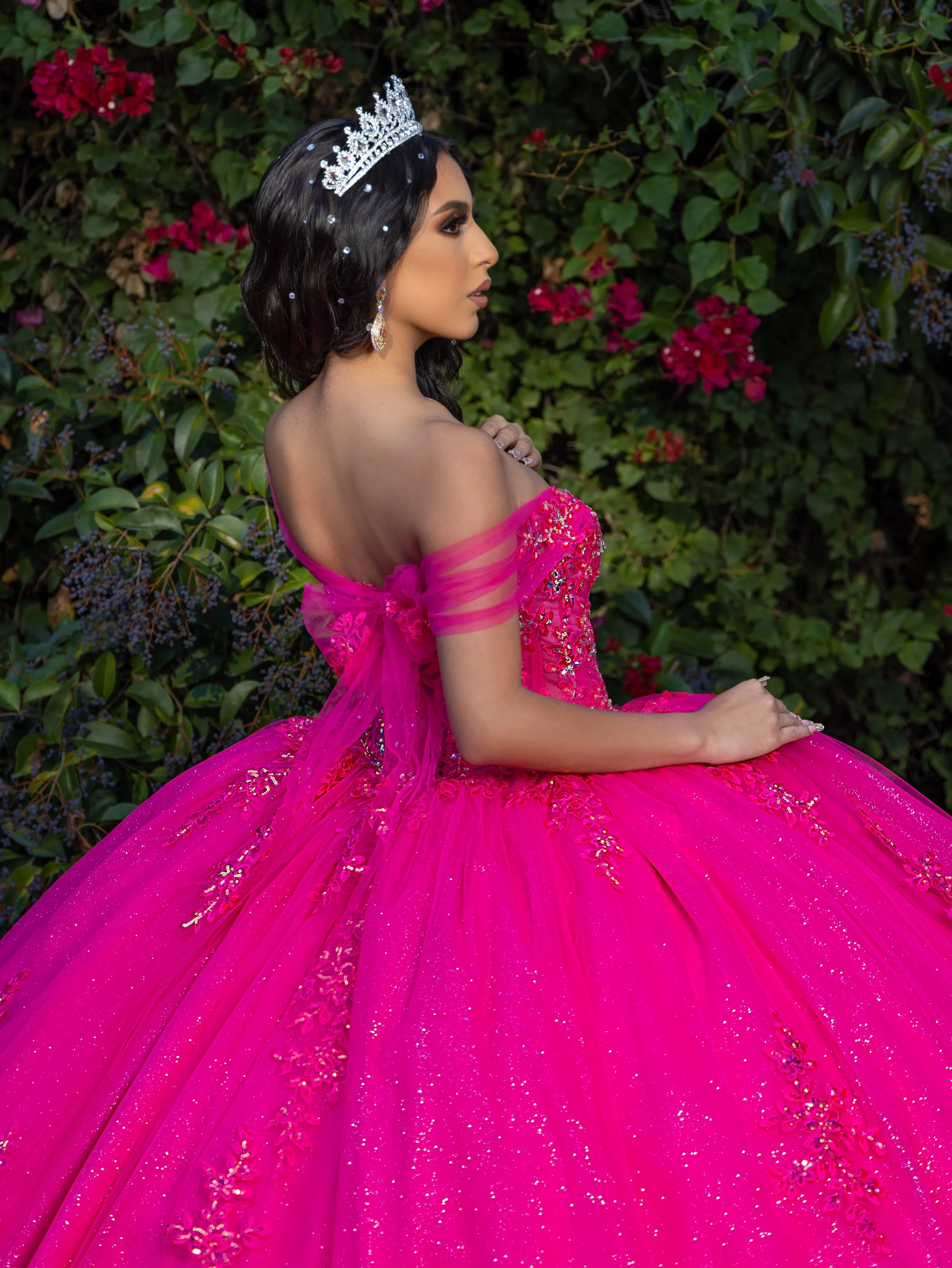 This quinceanera ball gown features a fully beaded bodice with corset boning detail and a full ball gown skirt adorned with sparkling floral lace applique. A lace-up corseted back ensures a secure fit. Matching lace applique is hand-placed all around the bottom hem to finish this look.